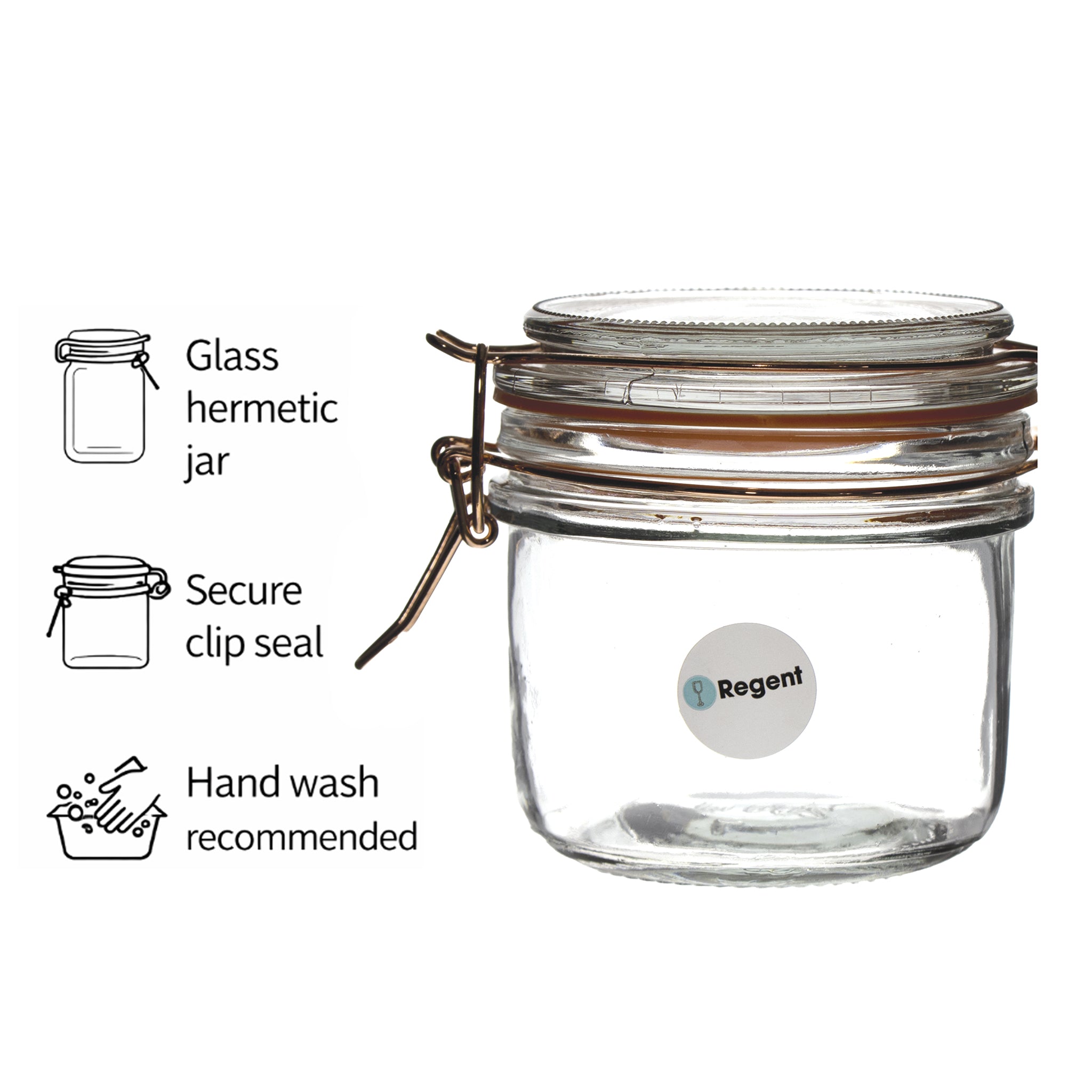 These Fabulous Regent glass round hermetic jars, each with a 200ml capacity, come in a convenient 6-pack and feature a secure rose gold clip closure. Designed for airtight sealing, they preserve freshness and protect contents from moisture and air exposure. Ideal for storing spices, herbs, small pantry items, homemade preserves, and dry ingredients. The durable glass construction ensures long-lasting use while the elegant rose gold clips add a sophisticated touch to your kitchen organization.
